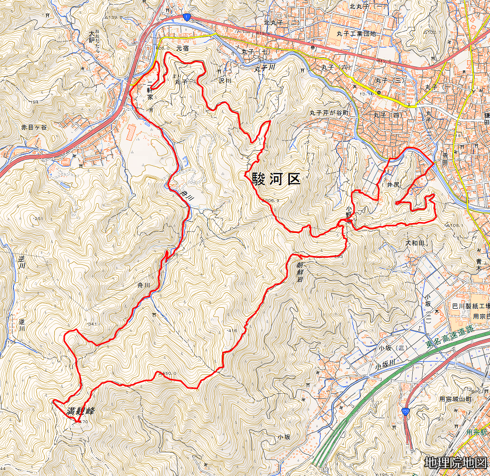 往路は、井尻峠から満観峰へ、復路は、舟川方面へ下り、芹ヶ谷峠と的山峠を経由して戻ってくる周回ルート。